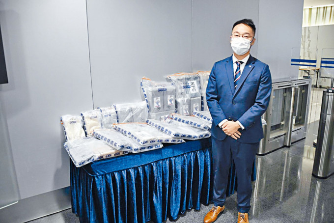 ▲毒品调查科行动组高级督察曾宪钊展示检获的可卡因。