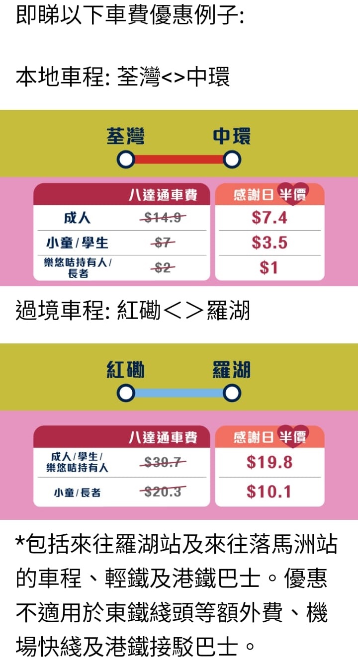 •于2023年4月8日、4月9日、5月13日及5月14日,使用八达通乘搭港铁(包括来往罗湖及落马洲站的车程),每程付费车程即自动享有50%车费扣减; 轻铁及行走新界西北路线的港铁巴士均提供此优惠。