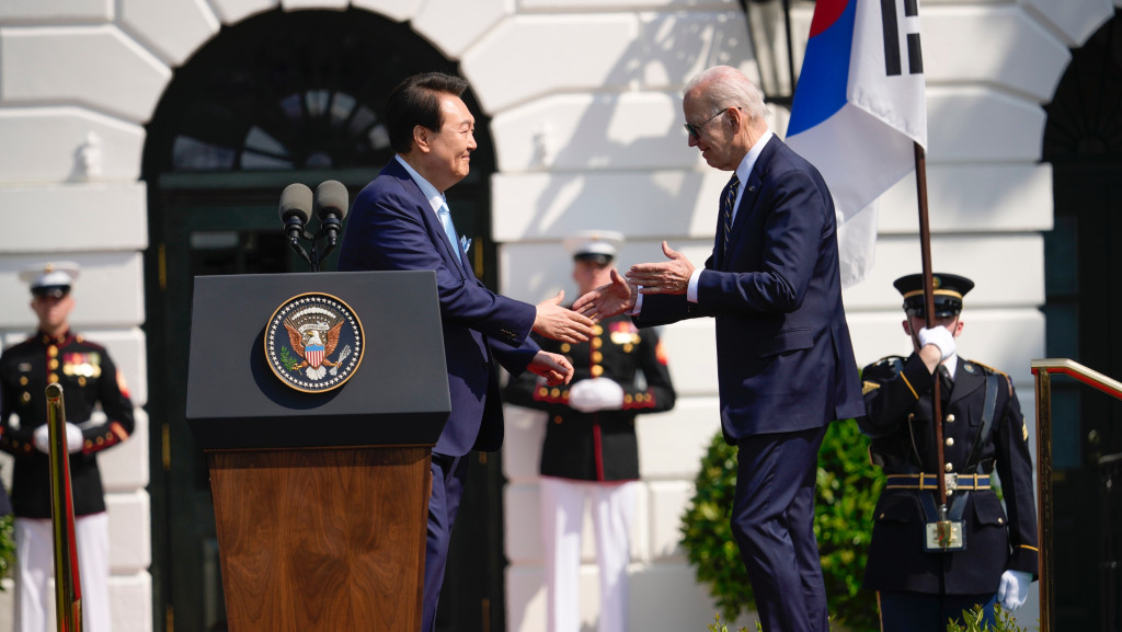 尹锡悦这次访美是韩国总统逾十年以来首度对美国进行国事访问,白宫安排隆重盛大仪式。拜登和尹锡悦发表“华盛顿宣言”(Washington Declaration)。美国官员事前表示,此宣言内容包括新设聚焦核武及战略规划热点的定期协商机制“美国-大韩民国核咨商小组”,就美国吓阻和回应区域核事件提出应变计划和呼吁。该美官员明确指出,这并不意味韩方能够干预美方的核武使用决策,决定使用核武器完全是唯有美国总统才能行使的权力。韩国还会再度确认它对核不扩散条约的承诺及无核地位。