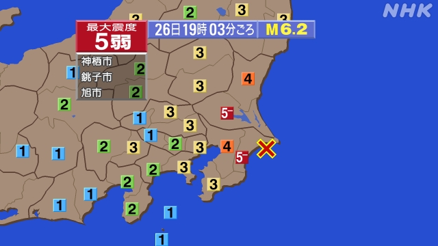 根据日本气象厅资讯,地震发生于当地时间周五晚上7时3分,震央位于千叶县近海,震源深度50公里,规模6.2级。日本本州多县有感,北起宫城县、山形县,南至静冈县、山梨县,震度介于2到3。最大震度为茨城县神栖市、千叶县的铫子市与旭市,震度为5弱。