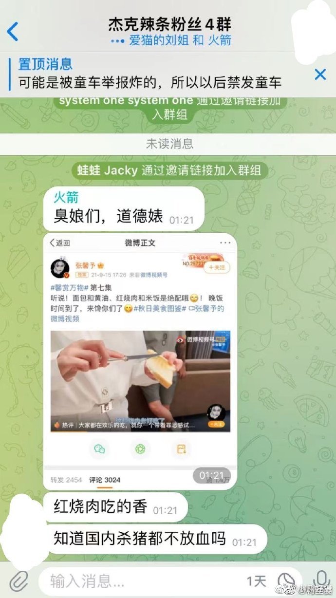 “鸭圣婆”表示,自从张馨予为反虐发声后,杰克辣条粉丝就在群里扬言要给张馨予“开盒”(即非法获取个人信息)。