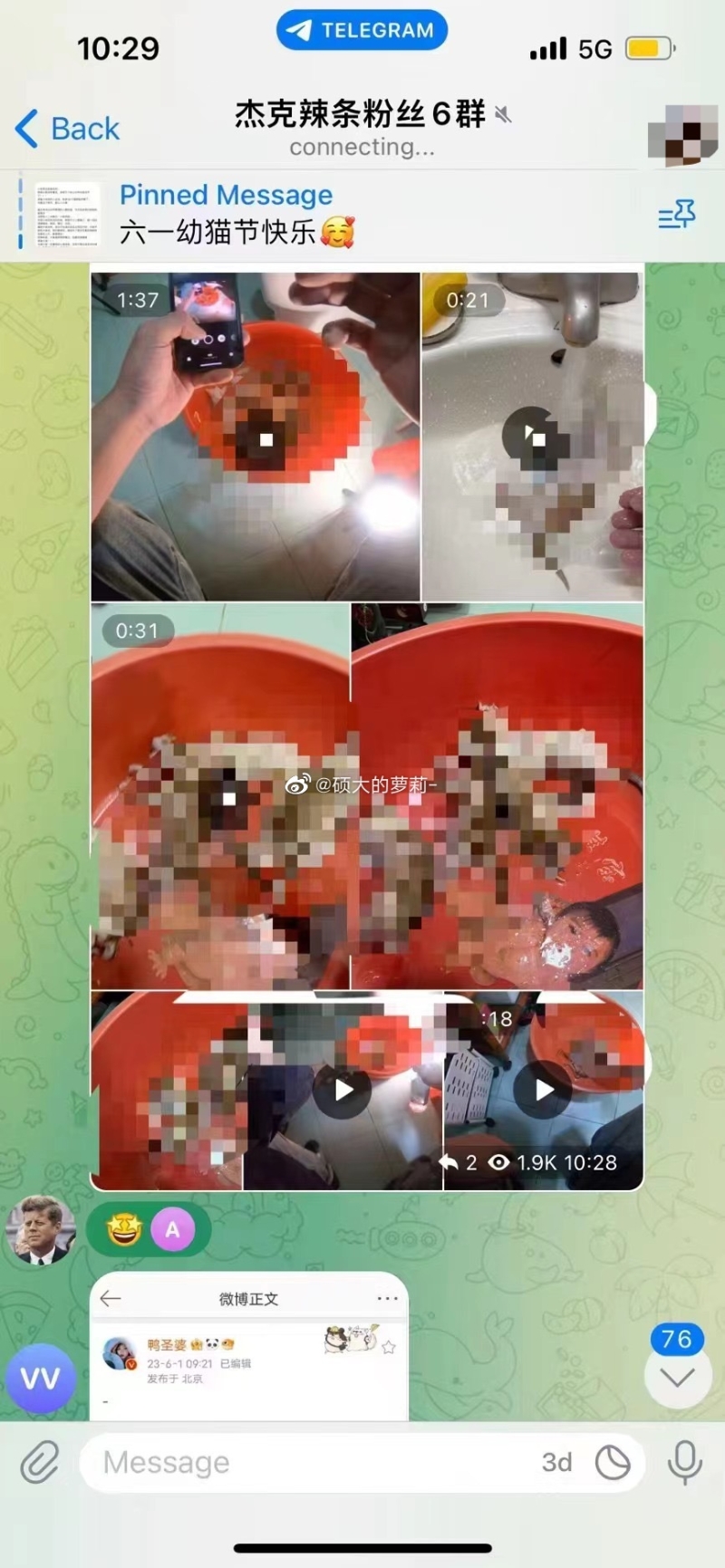 网红“杰克辣条”今年4月底被揭发“处刑式虐猫”,遭网民群起围插,艺人明星也纷纷发声反对虐待动物。 5月30日,有人在微博上爆料,指虐猫群体为了报复,持续在社交软件Telegram的群组公开这些艺人明星的个人资料。 受害艺人包括张馨予、赵露思、姜云升、肖战、王一博、舞蹈家金星等,疑似泄露的个人资料包括电话号码、身份证和社保信息。