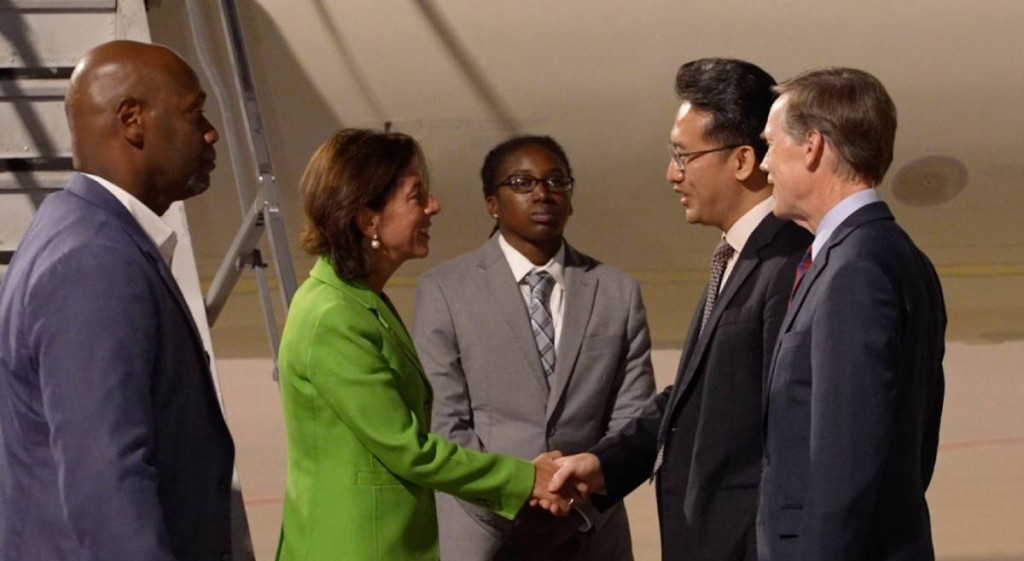 27日晚,美国商务部部长雷蒙多乘机抵达北京,中国商务部美大司司长林峰到场接机。这是雷蒙多首次访华,为期4天。行前,美国商务部宣布取消对27家中国实体的制裁,释放善意。