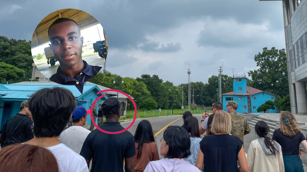 ▲特拉维斯·金(Travis King)越境前随团参观板门店的身影曝光。路透社