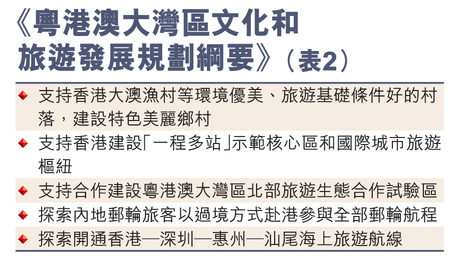 有业界人士坦言,内地有更美的自然景观,香港恐被比下去。惟学者认为,本港不宜把其他内地城市视为对手,而应串连邻近城市,增加旅游资源。根据国家文化和旅游部、粤港澳大湾区建设领导小组办公室及广东省人民政府发表的《粤港澳大湾区文化和旅游发展规划》(见表2),目标将香港打造为“一程多站”的示范核心区和国际城市旅游枢纽。尹振英说,长远而言,政府应考虑建立大湾区联盟,推出大湾区旅游产品,“香港地理位置方便,旅客可以香港为落脚点,进行一程多站的大湾区旅游,从而吸引旅客在香港多玩几天。”