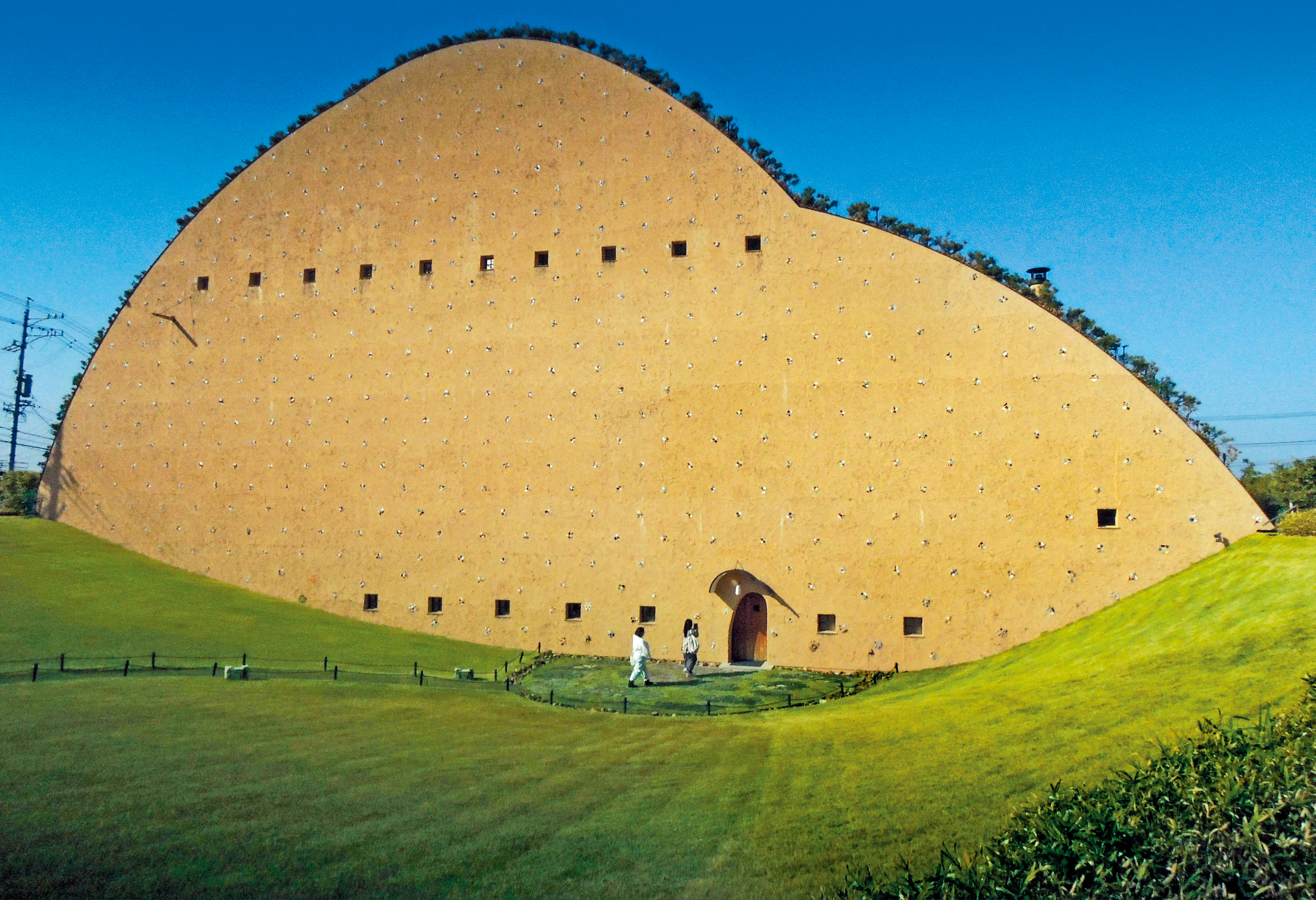 多治见市马赛克瓷砖博物馆,外观已是极具特色的艺术品,藤森照信将博物馆设计成提供瓷砖原材料的巨大黏土采集场模样,泥黄色外墙上只饰以当地居民捐赠的茶碗碎片及装饰瓷砖,加上窗户不多,予人极神秘及一见难忘的印象。