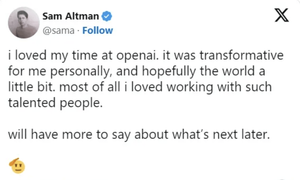 OpenAI 发布博客后不久,奥尔特曼在社交平台X 上发文表示:“我喜欢在OpenAI 的时光。这对我个人来说是变革性的,希望世界也能有所改变。 最重要的是,我喜欢与如此有才华的人一起工作。”