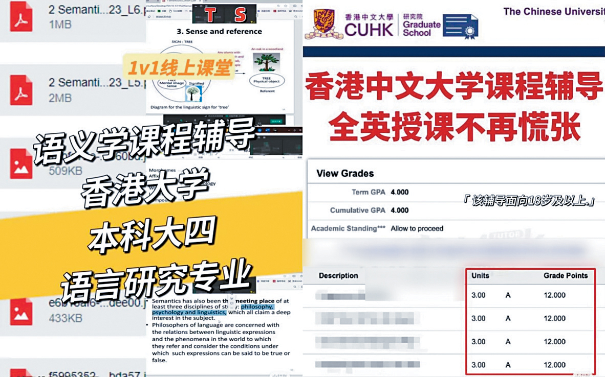 另有机构表列出近期香港留学生的补习案例,包括港大全球组经济学硕士于考试前一星期报读“鸡精班”后取得佳绩,亦有大学生紧急找即日导师补习,只为解决一道作业难题;帖文还附上一张中大成绩单,证明有学生稳夺“全A”及4分GPA(成绩平均绩点),务求让学生成为“过3爆4”的“学霸”。