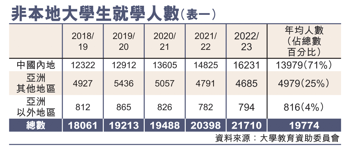 为将香港打造为“国际专上教育枢纽”,《施政报告》提出加大资助专上院校非本地学生限额一倍至40%,并加强奖学金和相关配套,期望吸引更多外国和内地学生来港升学。过去5个学年平均有近1.4万名内地生来港就读大学,占非本地生逾70%。学友社学生辅导顾问吴宝城预期,下学年加大非本地生学额后,留学生仍以内地学生为主,而过去一些未达收生门槛、成绩稍逊的学生,届时都可望来港升学。