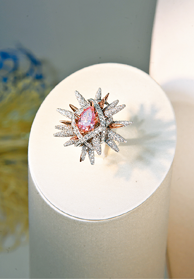▲星晨海胆(Sea Urchin)铂金及18K玫瑰金钻石指环,镶嵌单颗浓彩紫粉色钻石。