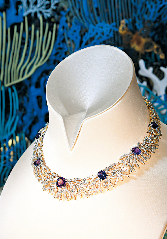 ▲珊瑚溢彩(Coral)铂金及18K黄金钻石项链,镶嵌未经优化处理紫色蓝宝石。