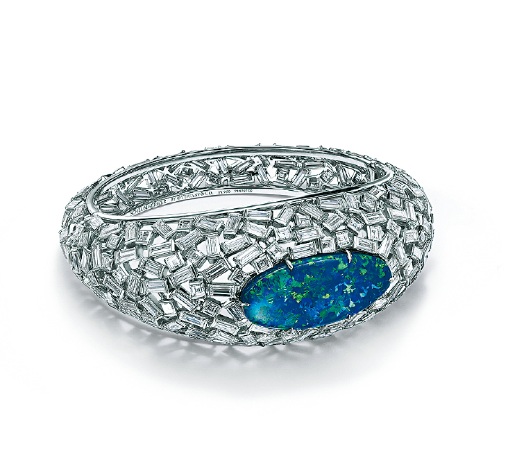 ▲瀚海星螺(Shell)铂金钻石手镯,中央镶嵌单颗黑色蛋白石。