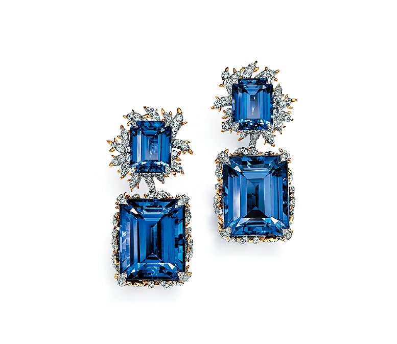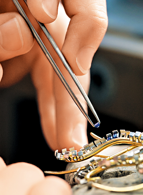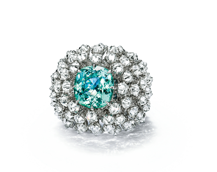 除了形态,要在视觉上营造海洋之景,颜色很重要,当中或蓝或绿的宝石就成为热选,系列亦大量运用斯里兰卡莲花蓝宝石、海蓝宝石、坦桑石,以及一种蓝色含铜锂碧玺,打造富层次感的色彩层递,呈现海底生物在光线折射下的立体感,再配以钻石或月光石,绽放通透明亮光芒。