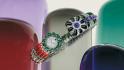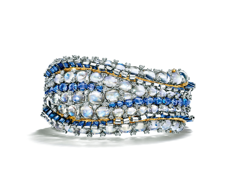 ▲水母绮梦(Jellyfish)铂金及18K黄金手镯,镶嵌蓝宝石、蓝宝石、坦桑石、月亮石及钻石。