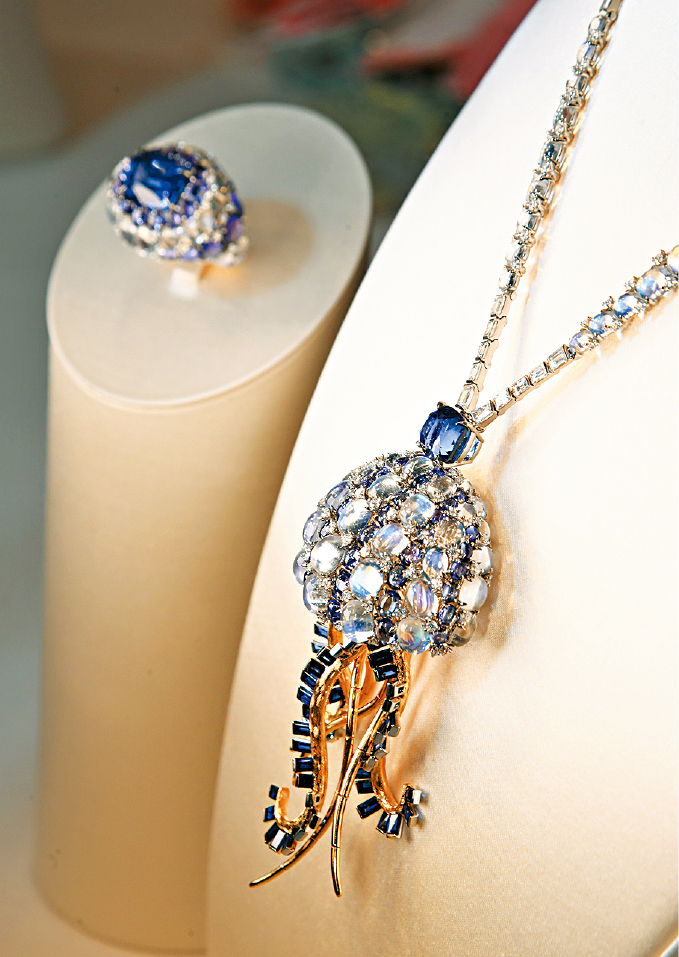 ▲水母绮梦(Jellyfish)铂金及18K黄金钻石项链,镶嵌未经优化处理蓝宝石、蓝宝石、坦桑石及月亮石。