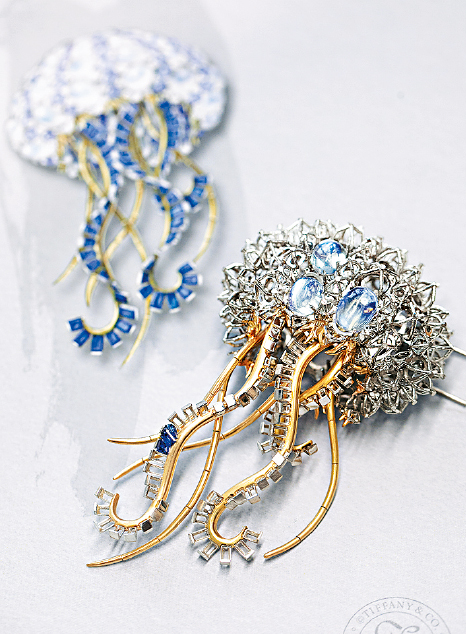珠宝作品的慑人之处,在于其抽象几何的元素,化身成点题的形态,正如Tiffany & Co.珠宝及高级珠宝艺术总监Nathalie Verdeille指出,全新的Out of the Blue高级珠宝系列,走在拟态与风格化、描绘与具象、写实与抽象的大自然之间,藉着美钻与宝石的拼搭、精密的镶工、恰到好处的切割工艺, 令每种海洋生物翩然灵动的姿态活现眼前。