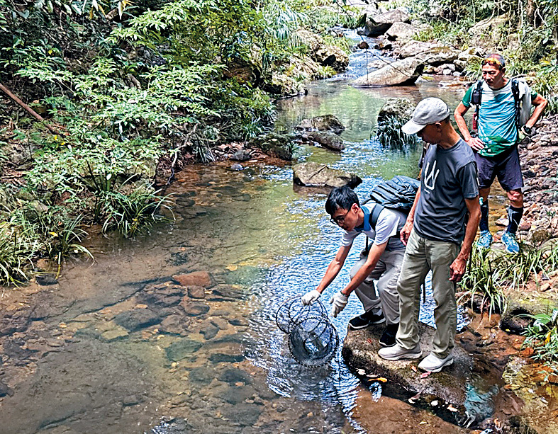 ▲黄锦星与民间组织“清径先锋”视察河溪,发现多个捕龟笼。
