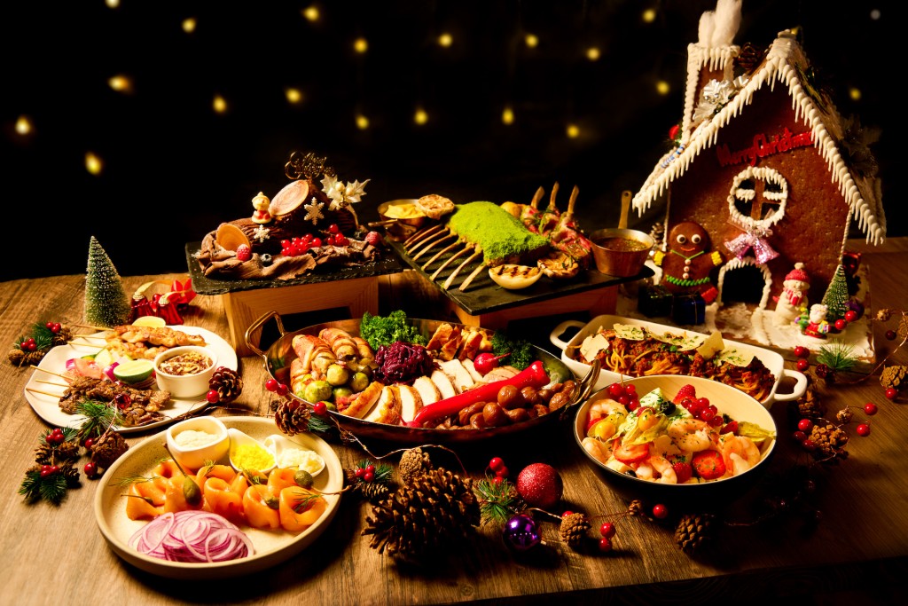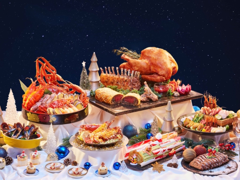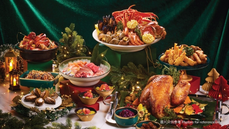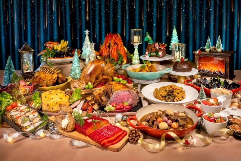 而圣诞节日自助餐美食包括有烤圣诞火鸡配鸡肝肉汁、传统面包酿馅、猪肉肠烟肉卷和小红莓酱、烤圣诞蜜糖火腿、传统热溶瑞士拉可雷特芝士等等,亦有香煎北海道带子配芝士忌廉汁及新鲜黑松露、即煮黑松露意大利粉、法式芝士焗生蚝; 喜欢吃海鲜的朋友就不要错过即开生蚝、龙虾、雪蟹脚。 甜品控必吃自家制意大利雪糕、瑞士瑞克雷奶酪雪糕、黑松露白朱古力慕丝、圣诞木头蛋糕、圣诞德国史多伦面包、传统圣诞布甸、法式炖蛋及芝士慕丝、姜饼木糠布甸及焗姜饼流心芝士挞。
