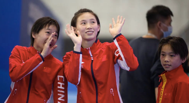 ▲陈芋汐(中)和全红婵(左)一直是良性竞争,互相促进。新华社
