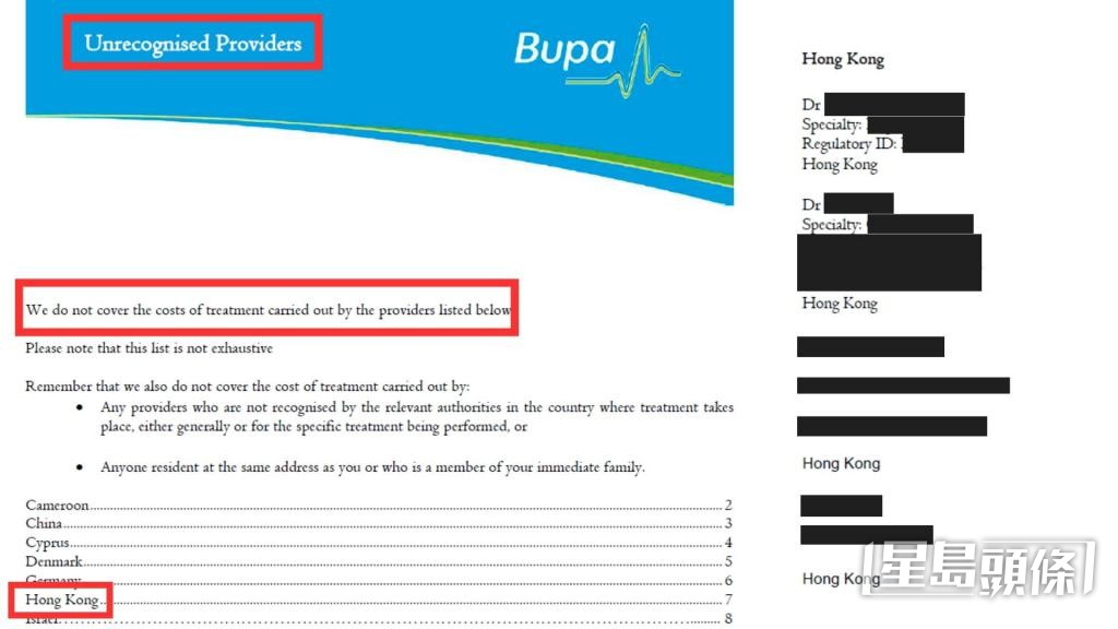 有保险公司近期向旗下经纪发出“Unrecognised Providers(未经认可的医疗服务供货商)”名单,本报取得该份印有“Bupa”标志的文件,文件列明,“We have written to the providers listed below to inform them that we do not recognise them for the purposes of our plans(我们已发信给下列供货商,告知对方我们不承认他们作为我们计划的一部分)”、“We do not cover the costs of treatment carried out by the providers listed below(我们不承担以下医疗服务供货商的疗程费用)”,而当中列出多间包括香港等地的医务中心名称和其地址,其中更有数字香港医生被“点名”,不乏知名肾病科、皮肤科和普通科医生。