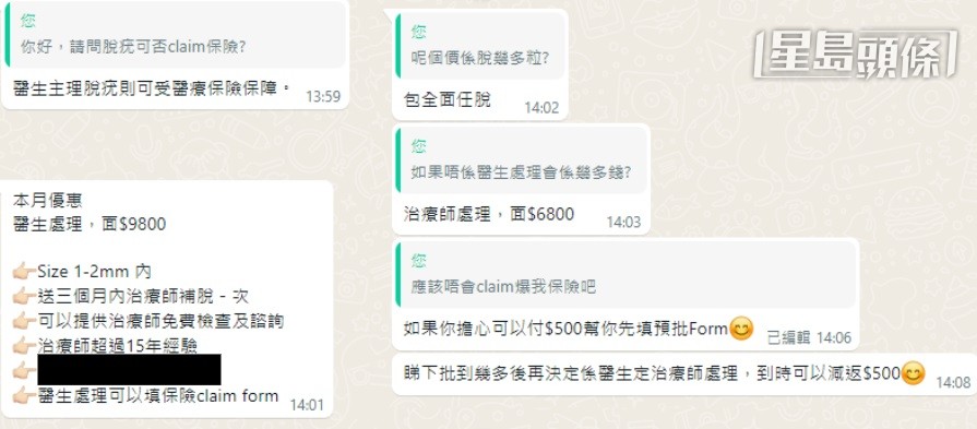 事实上,坊间不少医美和诊疗中心,在宣传时已声称脱疣由医生主理,可向保险公司索偿,“预判”脱疣属医疗需要。记者佯装客人询问其中一间医美中心Sxxx,职员指,“全面任脱”由医生处理的收费是9800元,治疗师处理则收6800元,更直言“可以先付500元,帮你先填预批表格,睇下批到几多后,再决定由医生定治疗师处理”。