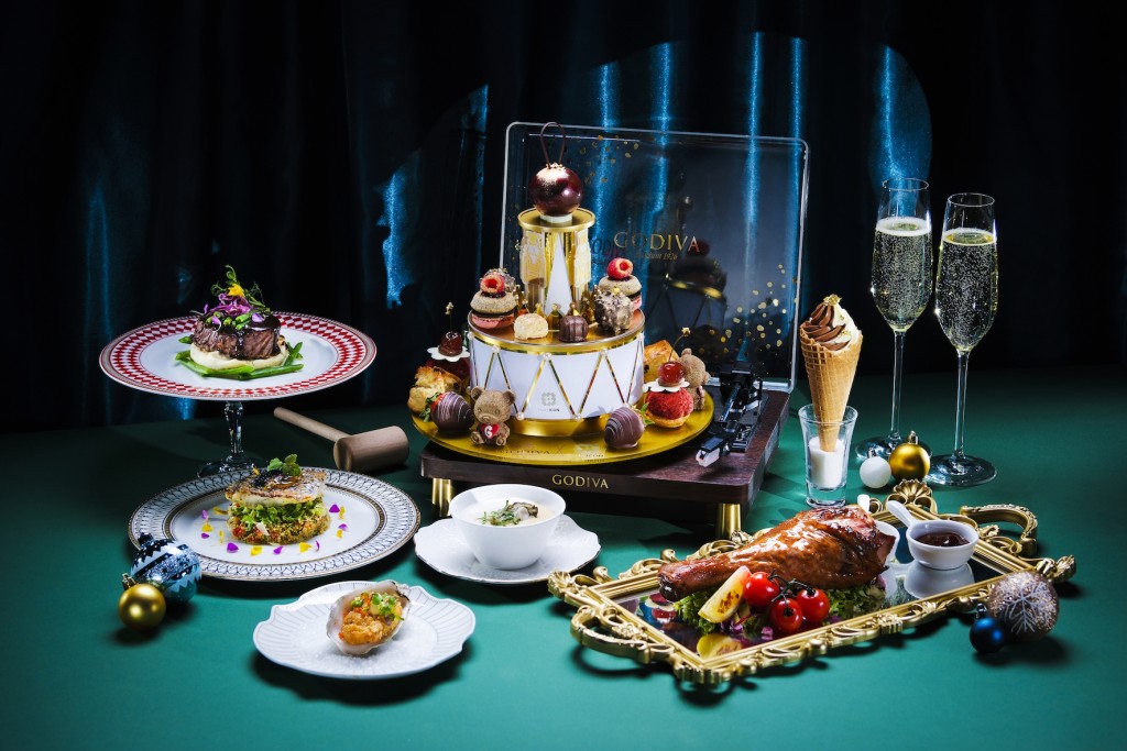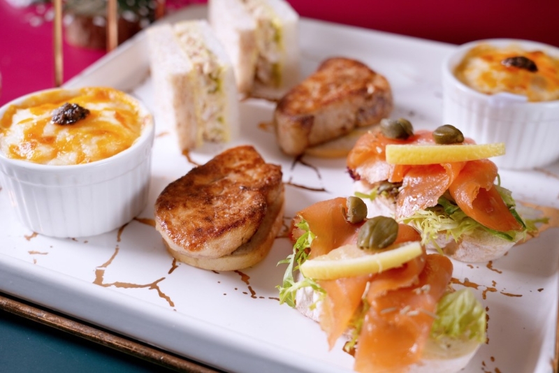 圣诞下午茶备有多款咸点,如车厘茄朱古力蛋奶酥、鹅肝配辣椒黑朱古力、黑椒牛肉塔塔牛油果泡芙、西班牙火腿松露三明治; 而6款甜点包括栗子蒙布朗蛋糕、66%法芙娜朱古力蛋糕、榛子浓咖啡杯子蛋糕、香橙红桑子马卡龙、蔓越莓果酱杯、蔓越莓松饼配玫瑰花瓣果酱及浓缩奶油,咸甜美点配以一杯特色鸡尾酒,让节日假日更有气氛!