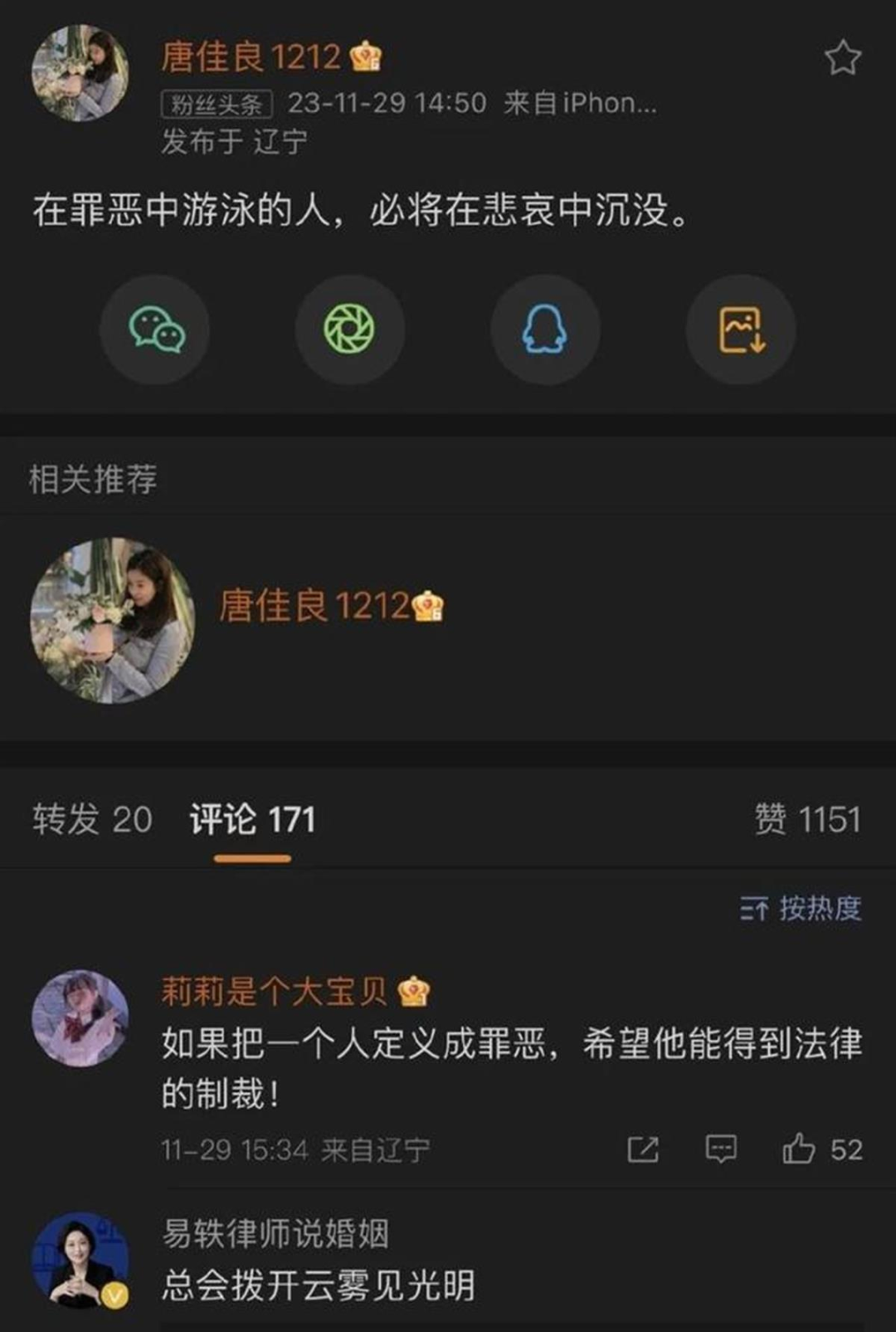 2023年11月29日,杨鸣妻子唐佳良在微博发文“在罪恶中游泳的人,必将在悲哀中沉默”。有网友发现,唐佳良已经取消了原本“杨鸣妻子”的认证,并删除多条杨鸣相关的微博。不少网友猜测,两人婚姻亮起红灯。