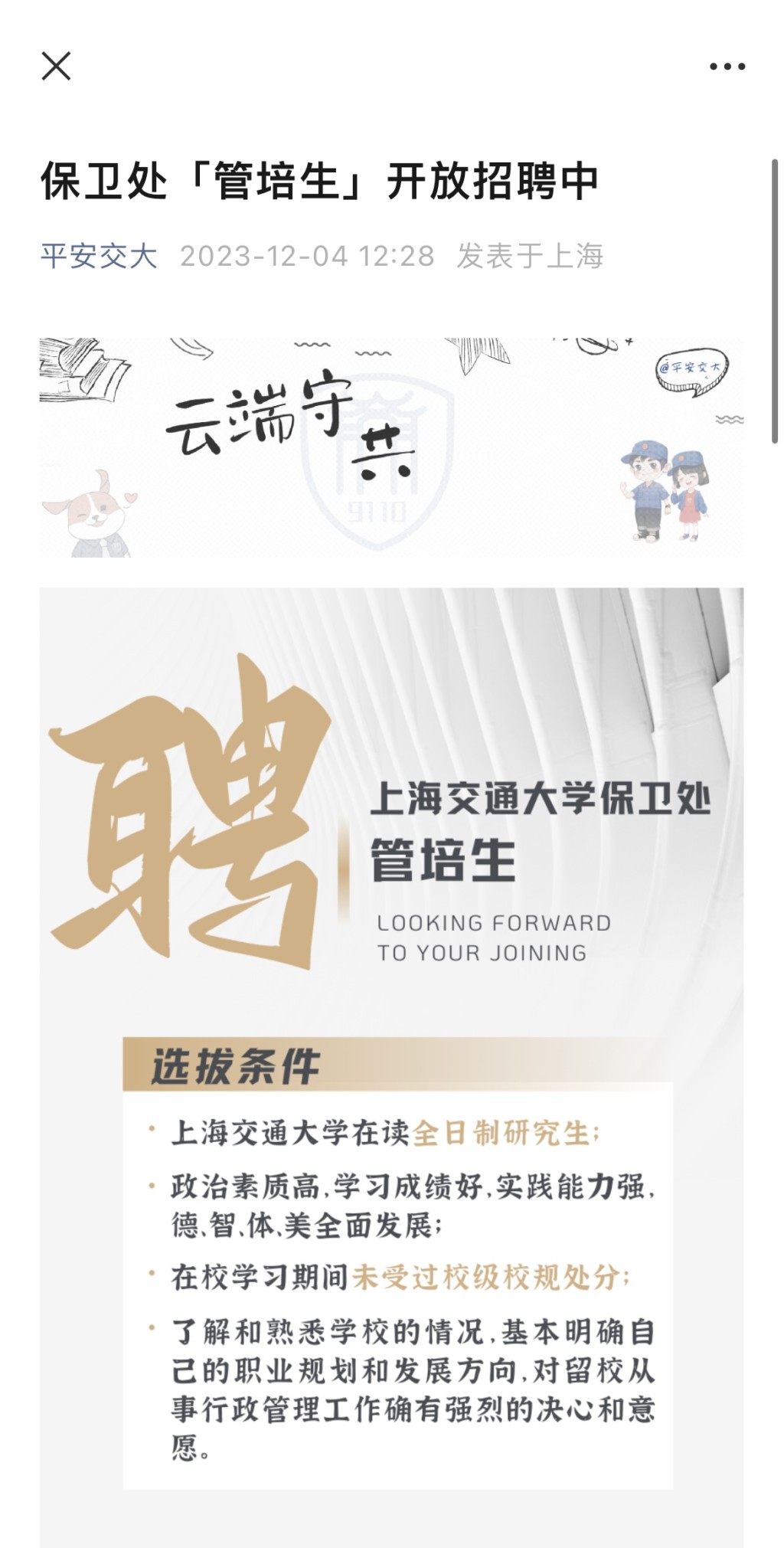 ▲上海交通大学保卫处近日一则招聘信息引起网络热议。
