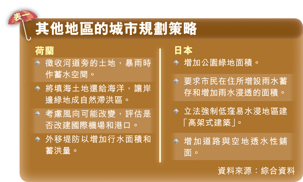 参考其他沿海的地区(见表一),以土地大多低于海平面的荷兰为例,因有完善的防灾规划,近年甚少受灾害影响。当地确立了“还地于水”和“还地于自然”的政策,包括征收主要河道旁的土地,平日供市民作休闲活动,暴雨时则作蓄水空间,也将部分填海而来的陆地“还给”海洋,让其成为自然滞洪区。