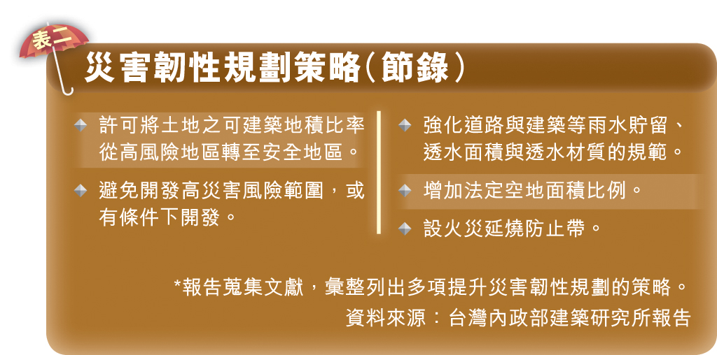 翻查台湾内政部建筑研究所去年就灾害韧性规划策略发表的研究报告(见表二),列举多项利用土地和基建规划减灾的方法,包括避免开发高灾害风险用地、容许转移高风险地区的开发权至安全地区,以及增加法定空地面积比例等。