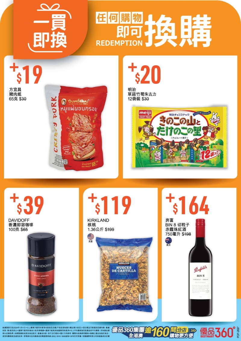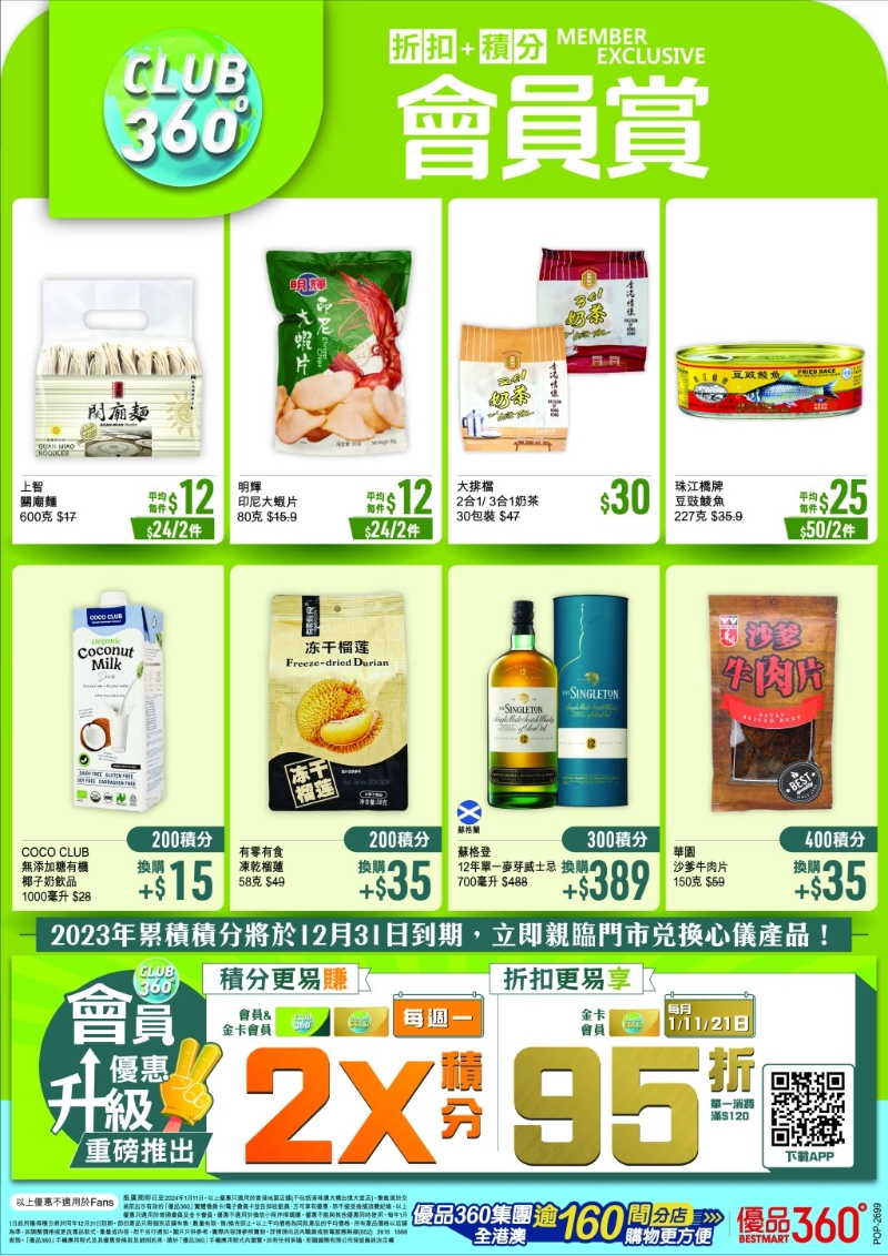 优品360 App会员、金卡会员消费$1可储1积分,1,000积分可当$10现金折扣,2023年累积的积分到期日至12月31日,逾期积分作废。2024年1月1日起累积的积分,将于2024年12月31日到期。