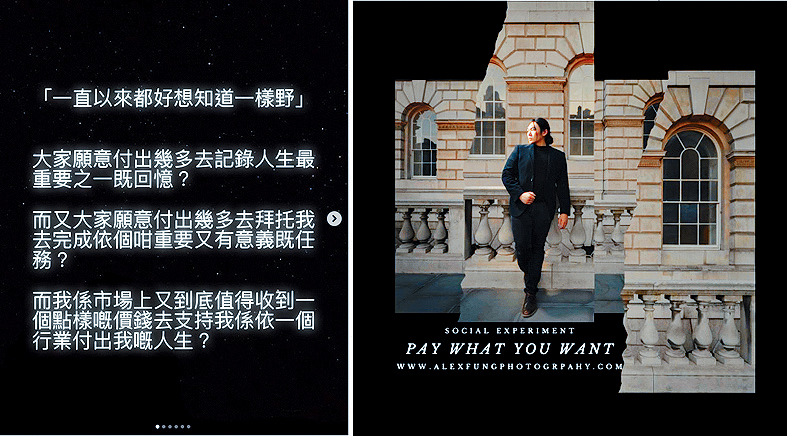 外人听起来任性,也违反社会运作,但Alex仍想抛开生意,帮一些想邀请他但预算不足的新人拍摄,同时了解人们愿意为拍摄人生大事的费用,“不希望因为价钱的限制,而令我错失替人记录的机会。”他为活动设立条款,避免非真正有需要的新人参与,“例如不可以同场有多位摄影师一同拍摄,这样不是我预期中没有经济能力而雇用我,是单纯占便宜。”