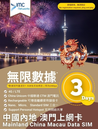 送100张IMC 3日中国内地澳门无限数据上网卡