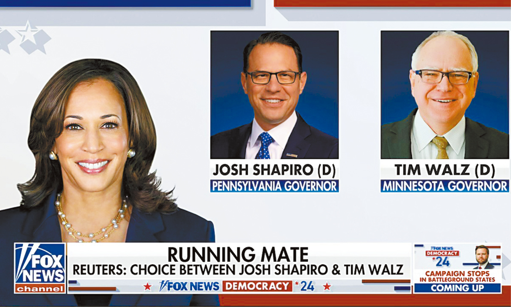 ▲消息指,副总统搭档人选的最终名单已缩窄至两人,分别是宾州州长夏皮罗以及明尼苏达州州长沃尔兹。电视截图