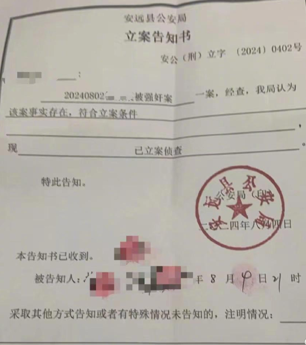 而据公安局8月4日晚9时出具的《立案告知书》显示,杜某某涉嫌被强奸一案,“经查,我局认为该案事实存在,符合立案条件,已立案侦查。”