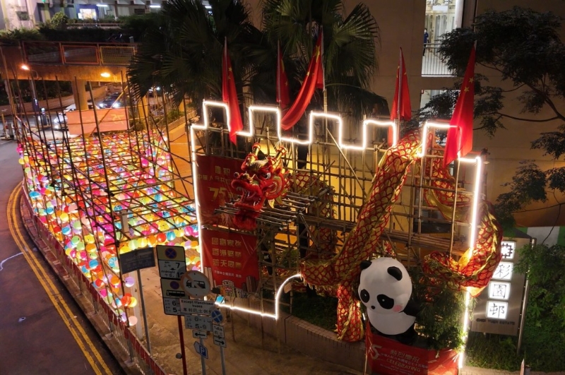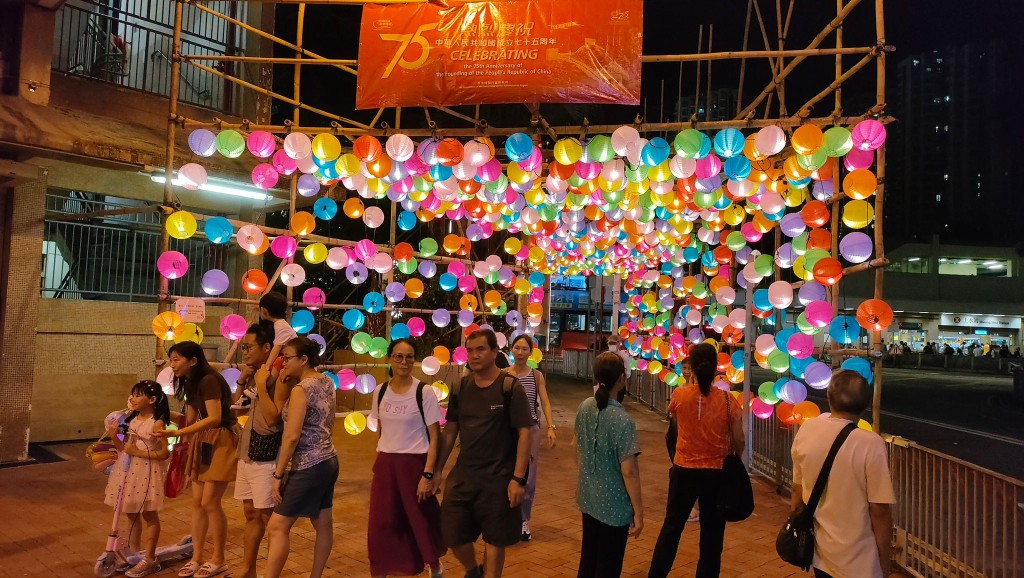 国庆将至,全港18区均有不同形式庆祝活动。其中北区上水彩园邨,为让街坊感受国庆75周年的喜悦气氛,搭建了挂满灯笼的巨型竹棚,夜晚时显得色彩缤纷,成为市民打卡热点。此外,又邀请小学和幼儿园学生在竹棚上写上祝福语,一同庆祝国庆。