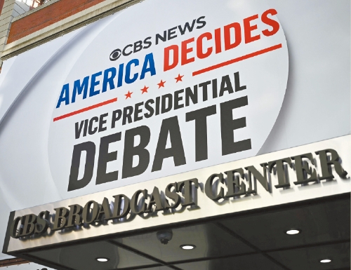 ▲图为副总统辩论会在纽约市举行之前,哥伦比亚广播公司广播中心外悬挂着标志。 法新社