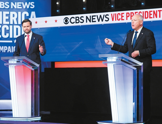 民主党副总统候选人沃尔兹(Tim Walz)与共和党提名人万斯(JDVance)举行唯一一场辩论,两人除了环绕外交、能源、移民、堕胎和国会骚乱等议题激辩之外,也把焦点指向彼此的竞选搭档,质疑对方并非理想的治国人选。虽然辩论本身非常激烈,但两人表现克制,没有进行人身攻击。