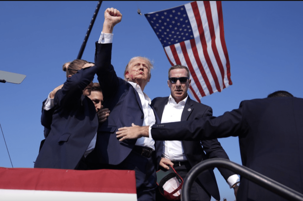 ▲这张特朗普遇刺受伤后,在国旗下振臂的照片成为经典照。 美联社