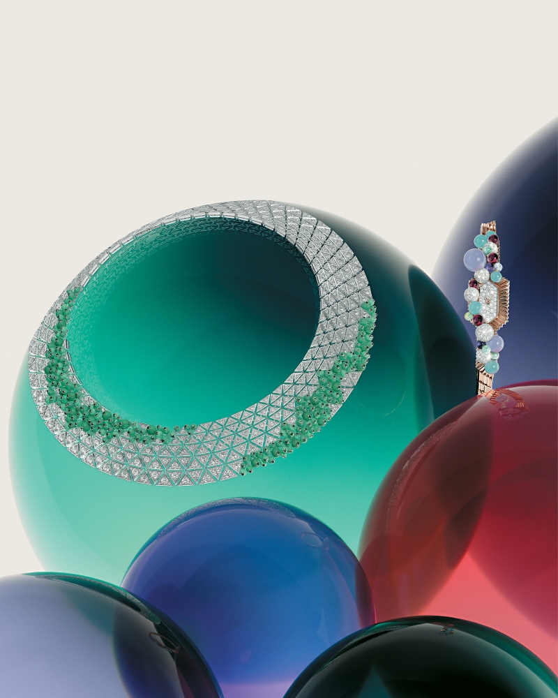 ▲左/Cartier Libre Tuttitutti高级珠宝系列Hiatus白金项链,镶嵌绿玉髓圆珠,以及由祖母绿及逾900颗明亮式切割圆钻(共34.61卡)组成的几何图案,带来对比鲜明的视效。右/Cartier Libre Tuttitutti高级珠宝系列Mir玫瑰金及铂金腕表,镶嵌208颗明亮式切割圆钻(共2.36卡)、蓝色和白色蛋白石、红碧玺、蓝玉髓及坦桑石,搭载石英机芯。