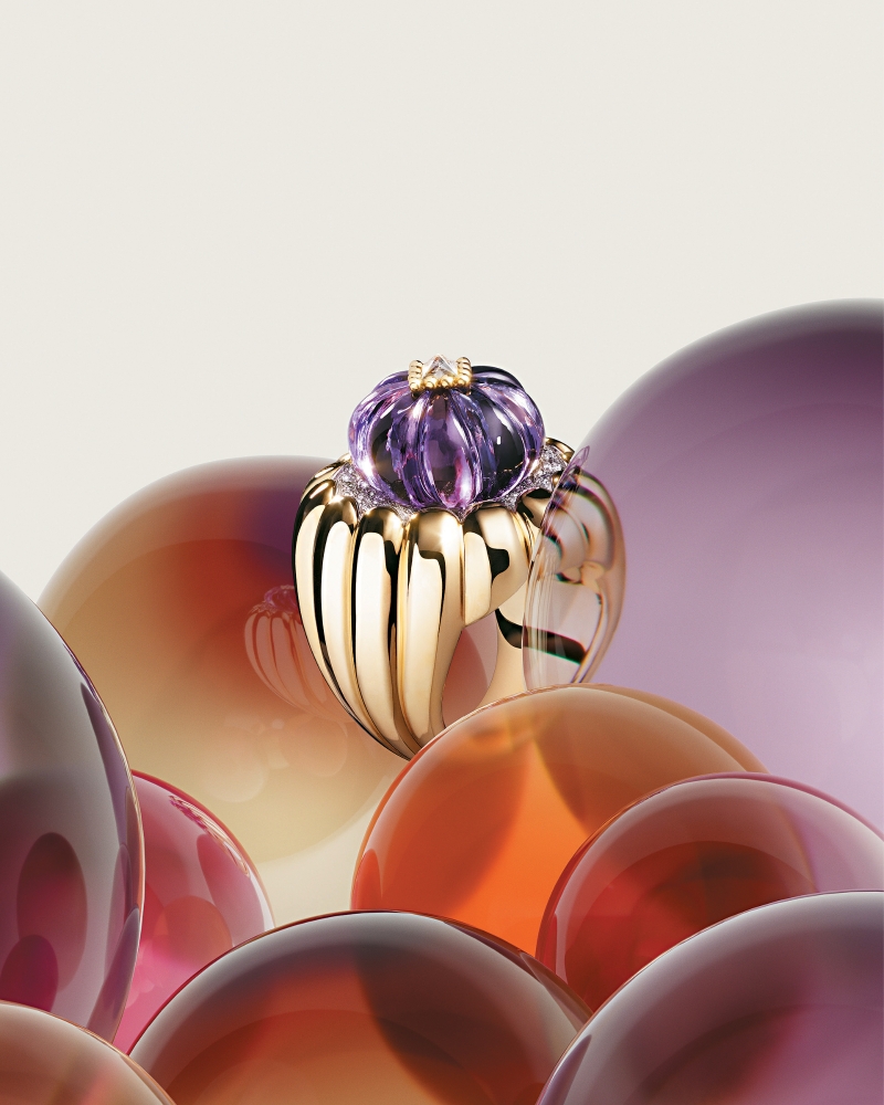 ▲Cartier Libre Tuttitutti系列Fruity Juicy黄金及白金指环,晶莹剔透的单颗瓜形切割紫水晶,令人垂涎,中央的珠镶花蕊镶嵌单颗公主方形切割钻石(0.14卡),另以112颗明亮式切割圆钻围绕(共0.5卡),造型设计相当精致。