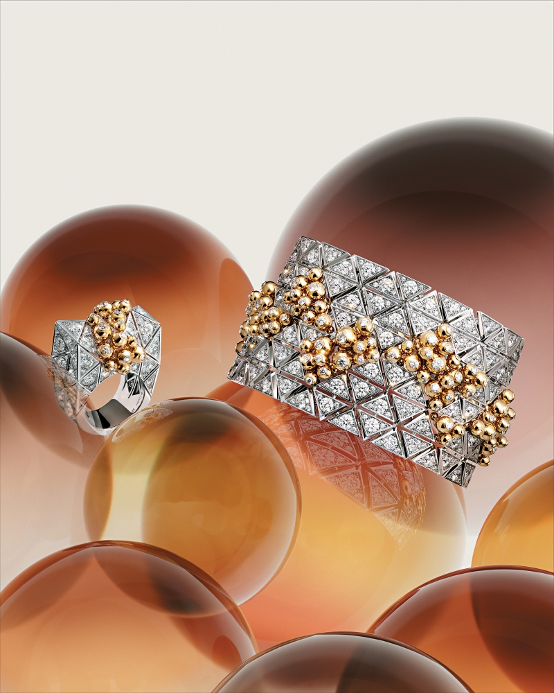 ▲Cartier Libre Tuttitutti高级珠宝系列Hiatus黄金及白金指环与手环,在规律的几何结构间缀以浑然天成的圆珠,营造出有序与无序的对比张力。左/指环镶嵌150颗明亮式切割圆钻(共5.97卡),右/手环则镶嵌627颗明亮式切割圆钻(共20.52卡)。