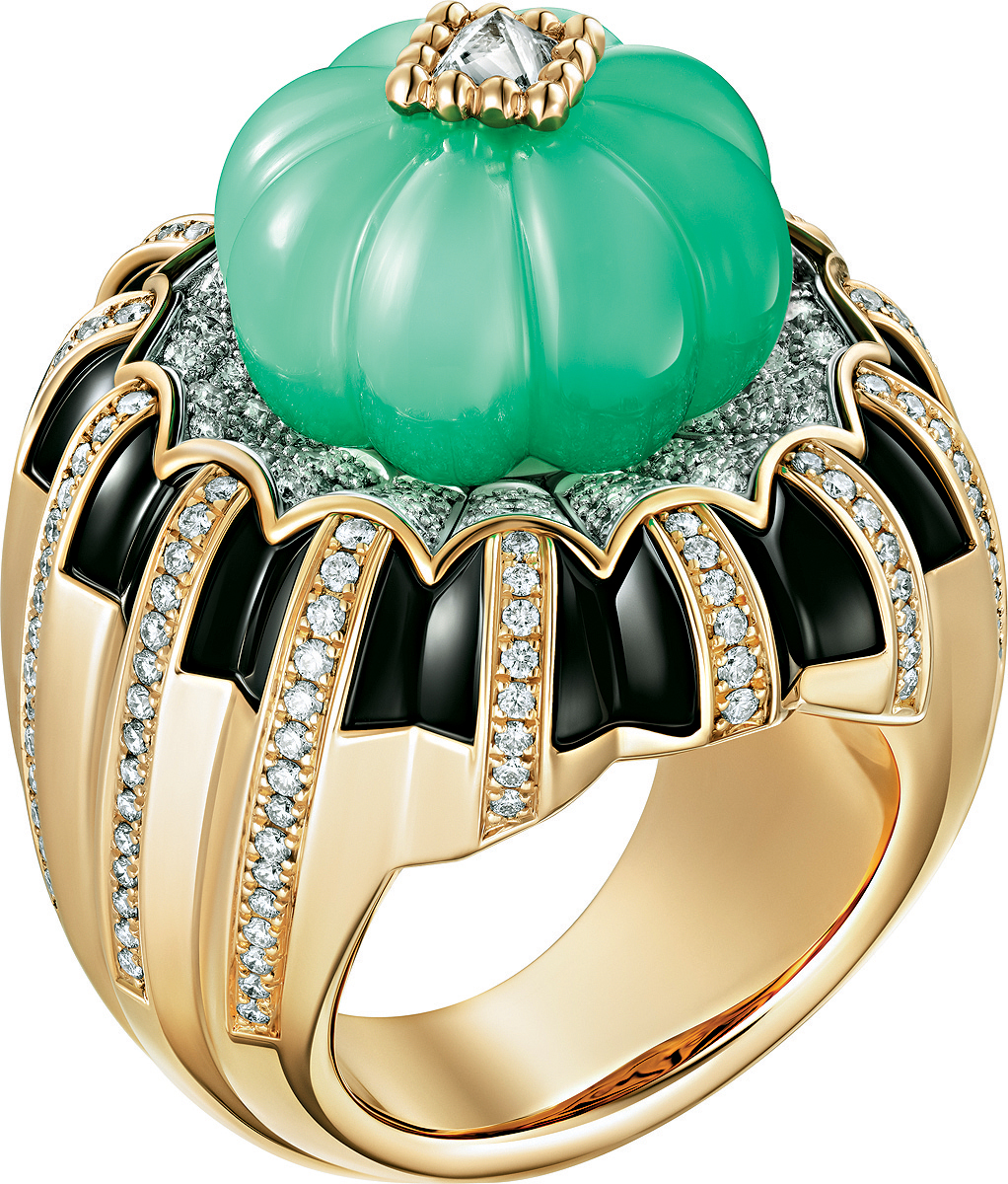 ▲Cartier Libre Tuttitutti系列Fruity Juicy黄金及白金指环,主石为单颗瓜形切割绿玉髓,另镶嵌14颗缟玛瑙、1颗公主方形切割钻石(0.14卡)及276颗明亮式切割圆钻(共1.13卡),拼凑出卡地亚自20世纪初已出现的黑、绿及白色经典颜色组合。