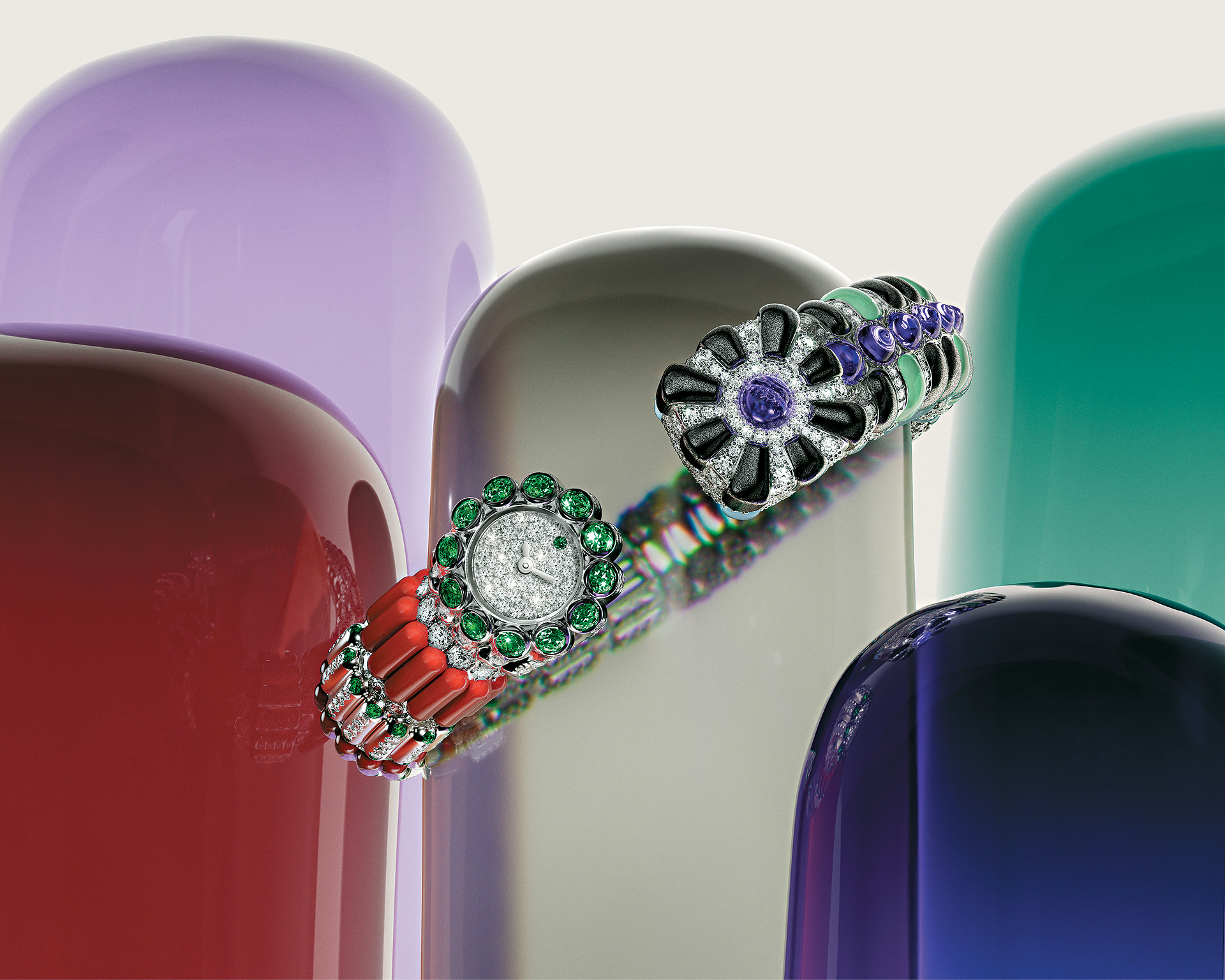 回溯Cartier Libre系列的首个系列为腕表作品,之后涉猎珠宝及其他配饰摆件等。今年全新登场的Tuttitutti系列亦不乏精彩的腕表佳作,当中采用全铰接结构拼立体表盘设计的Mir玫瑰金及铂金腕表,满布微型彩色宝石圆珠,包罗蓝色和白色蛋白石、红碧玺、蓝玉髓、坦桑石及镶钻铂金等,中央浮现的小巧表盘,缀以蓝宝石时标,随性的雪花式镶嵌表面与层次分明的表圈,以及玫瑰金纹理表链形成鲜明对比。另一款Hydre镀铑白金腕表的造型设计源自卡地亚的经典FaceaFace手环,藉 抽象风格演绎奇幻瑞兽主题,一边是珊瑚和祖母绿组成的红绿配色,另一边是蓝色与绿色,既是卡地亚的标志性色彩组合,同时呼应品牌始创人路易•卡地亚(Louis Cartier)的经典“孔雀图案”。雪花式镶嵌表盘位于珊瑚一侧的末端,凸圆形祖母绿环绕一圈,另搭以凸圆形银色黑曜石、玉髓、绿玉髓、紫水晶等,绝对是色彩与形态均丰富多姿的出色腕表作品。