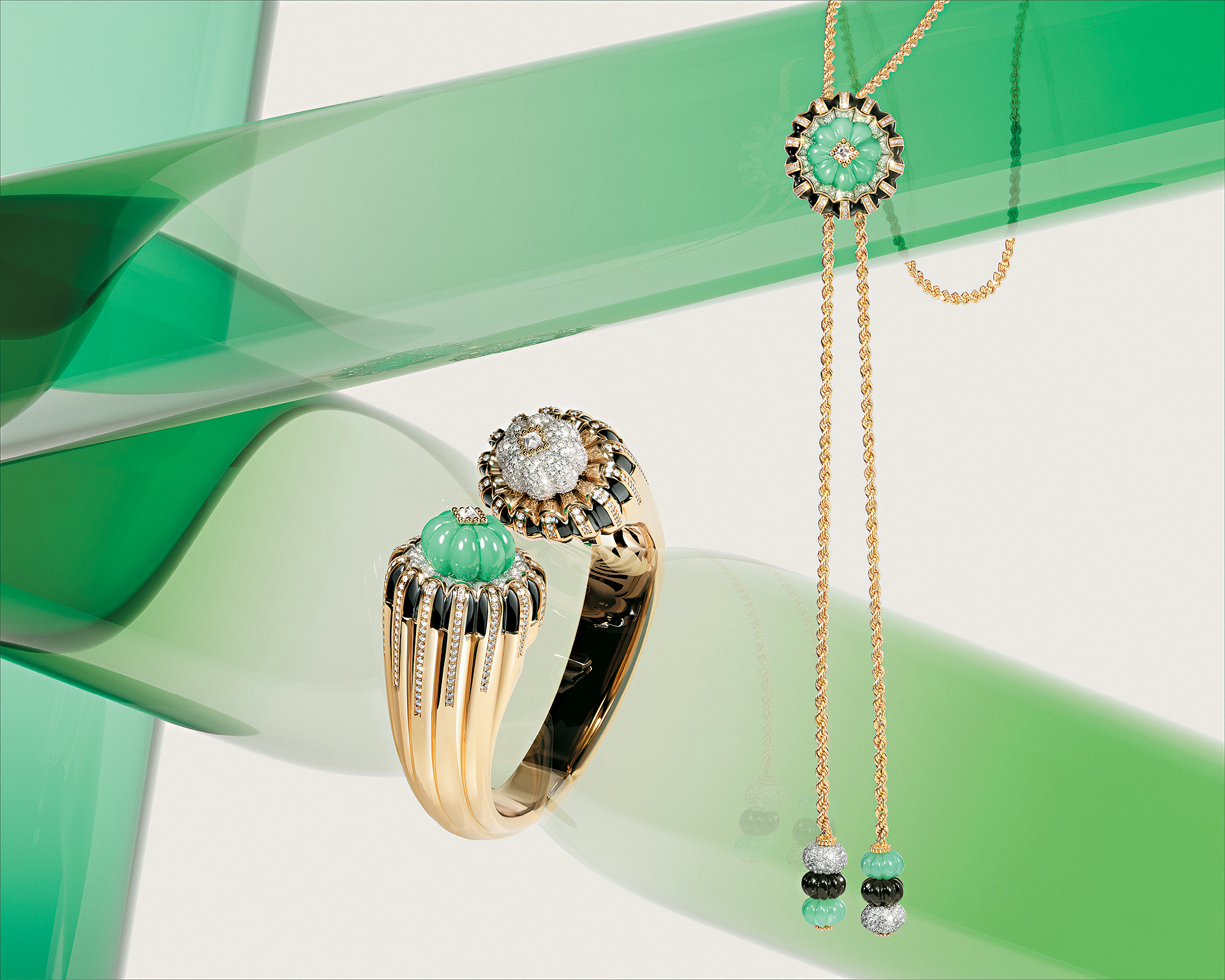 ▲左/Cartier Libre Tuttitutti系列Fruity Juicy黄金及白金手环,镶嵌单颗瓜形切割绿玉髓、28颗缟玛瑙、2颗公主方形切割钻石(共0.18卡)及606颗明亮式切割圆钻(共2.91卡)。右/同系列Fruity Juicy黄金及白金项链,镶嵌3颗绿玉髓、16颗缟玛瑙、3颗公主方形切割钻石(共0.23卡)及522颗明亮式切割圆钻(共2.17卡)。