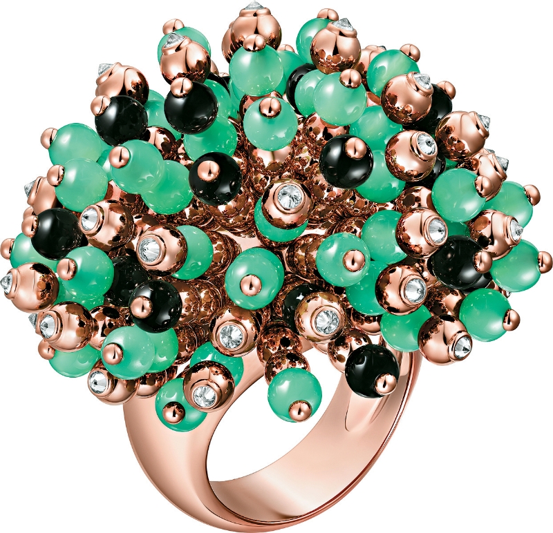 ▲Cartier Libre Tuttitutti系列Blossom玫瑰金指环,镶嵌绿玉髓、缟玛瑙、34颗明亮式切割圆钻(共0.49卡),流穗设计充满动感。