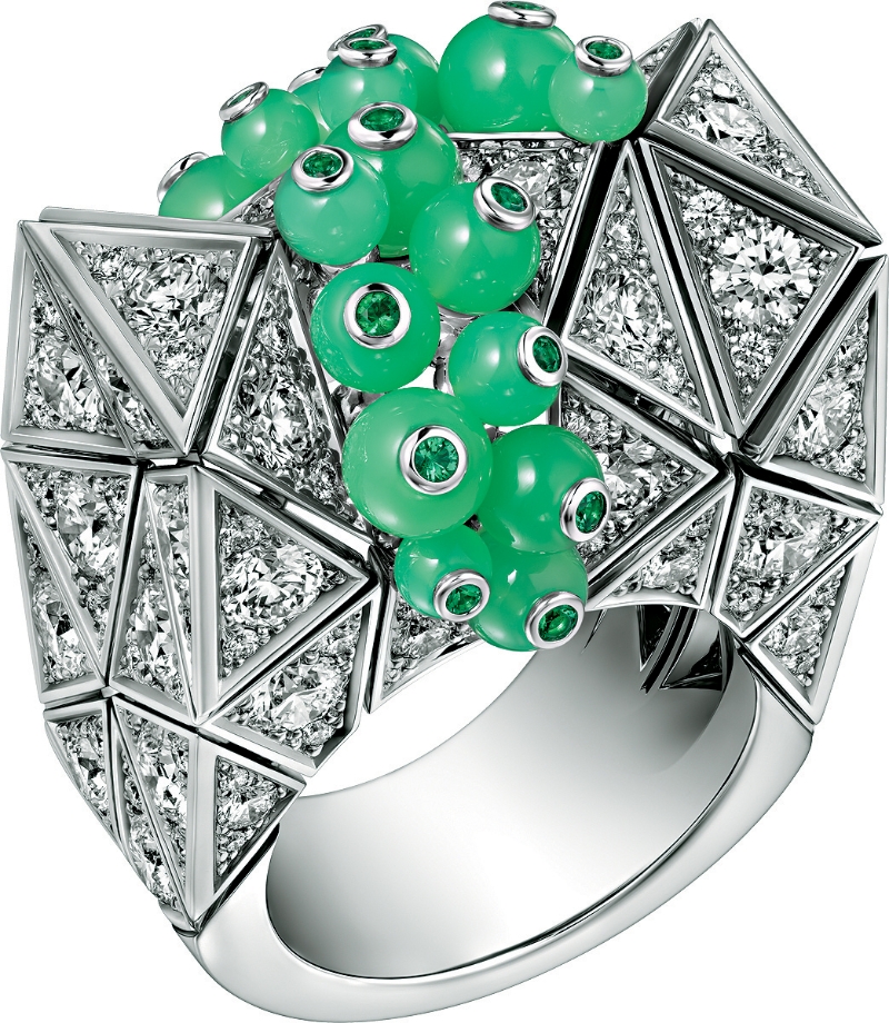 ▲Cartier Libre Tuttitutti高级珠宝系列Hiatus白金指环,镶嵌绿玉髓、祖母绿、131颗明亮式切割圆钻(共5.52卡),完美融合几何钻石与色彩圆珠。