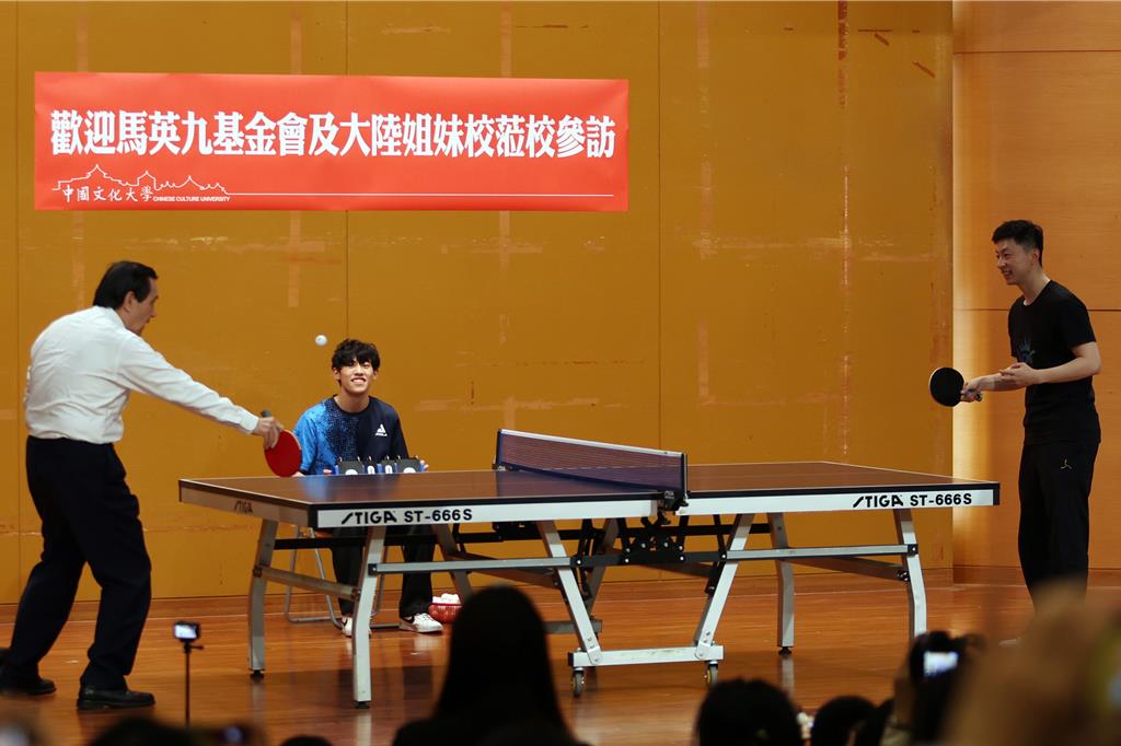 ▲大陆乒乓球名将马龙近日跟随陆生团访台,29日前往文化大学进行交流,并与台湾退役乒乓球名将蒋澎龙与巴黎奥运国手陈思羽切磋球技,上演奥运层级的交流赛。马英九(左)开球与马龙(右)切磋一下。