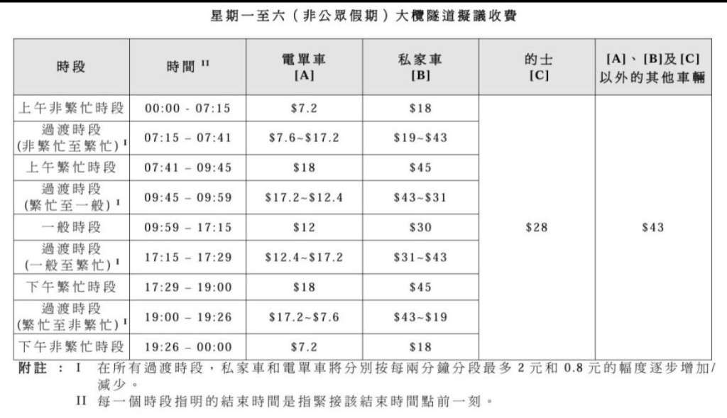 ▲周一至周六非公众假期的大榄隧道拟议收费。