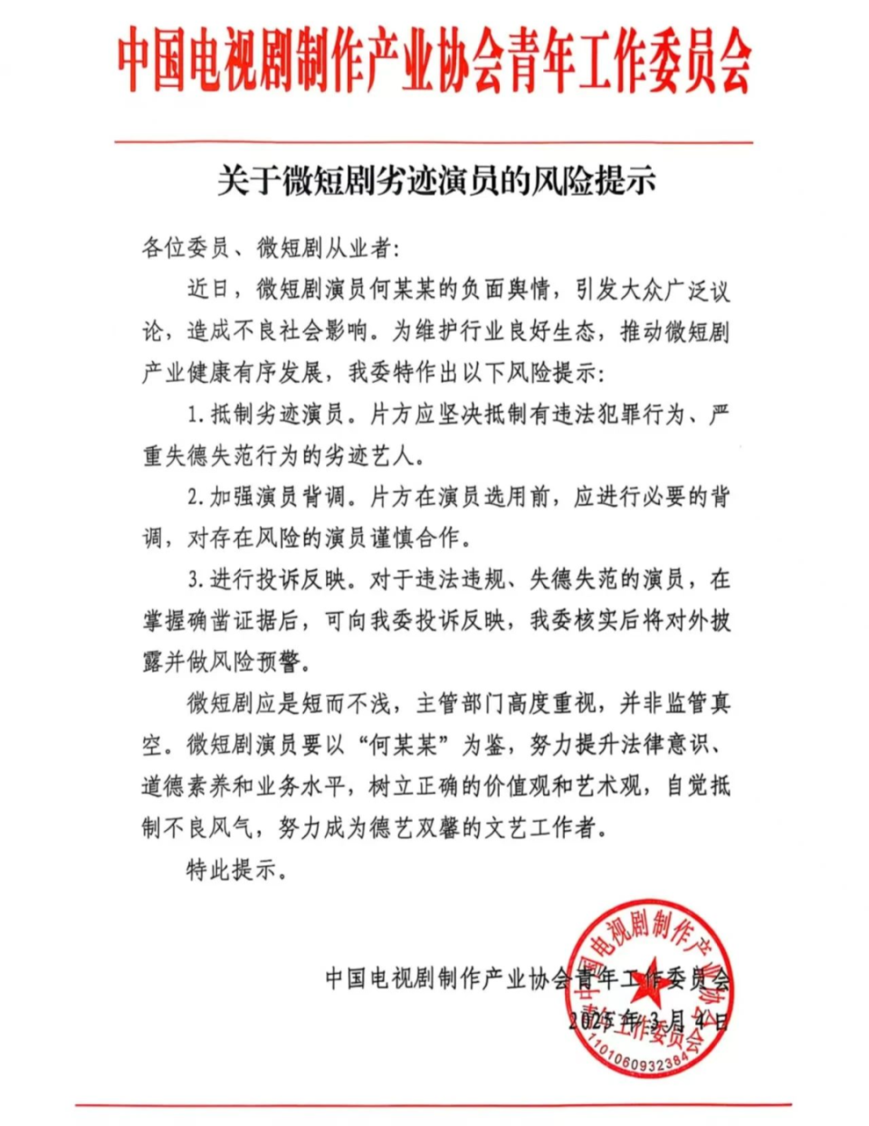 青工委4日晚发布的《关于微短剧劣迹演员的风险提示》中提到,近日,微短剧演员何某某的负面舆情,“引发大众广泛议论,造成不良社会影响”。青工委方面表示,为了维护行业良好生态,推动微短剧产业健康有序发展,特号召:片方应抵制劣迹演员,包括有违法犯罪行为、严重失德失范的劣迹艺人。